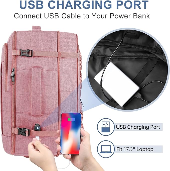 Carry On Backpack for Women, 50L Travel Backpack Flight Approved, Expandable Backpack For Airplanes, 17 Inch Laptop Backpack, Luggage Suitcase Daypack Lightweight Business Weekender Bag, Pink