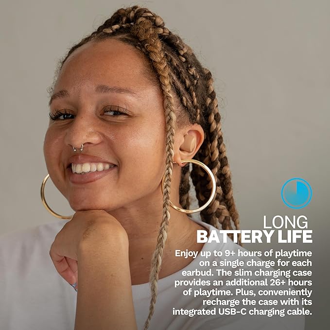 - Battery Life: Listen for the long battery life with your wireless earphones; stay for the comfort. Go Air Tones+ features 9+ hours of playtime in each earbud and 26+ extra hours from the charging case. Thatâs 35+ hours of playtime with your bluetooth earphones.