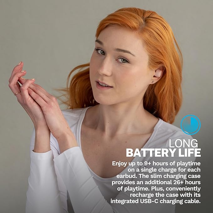 - Battery Life: Listen for the long battery life with your wireless earphones; stay for the comfort. Go Air Tones+ features 9+ hours of playtime in each earbud and 26+ extra hours from the charging case. Thatâs 35+ hours of playtime with your bluetooth earphones.