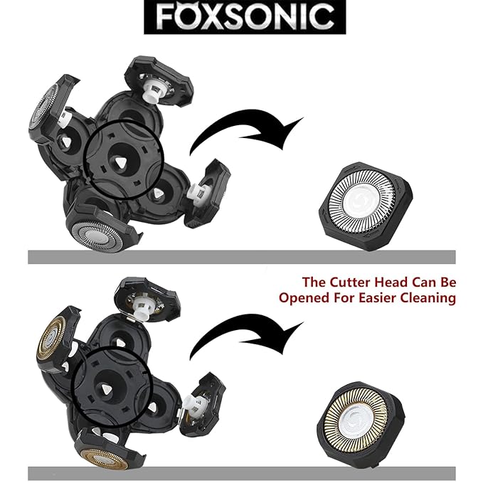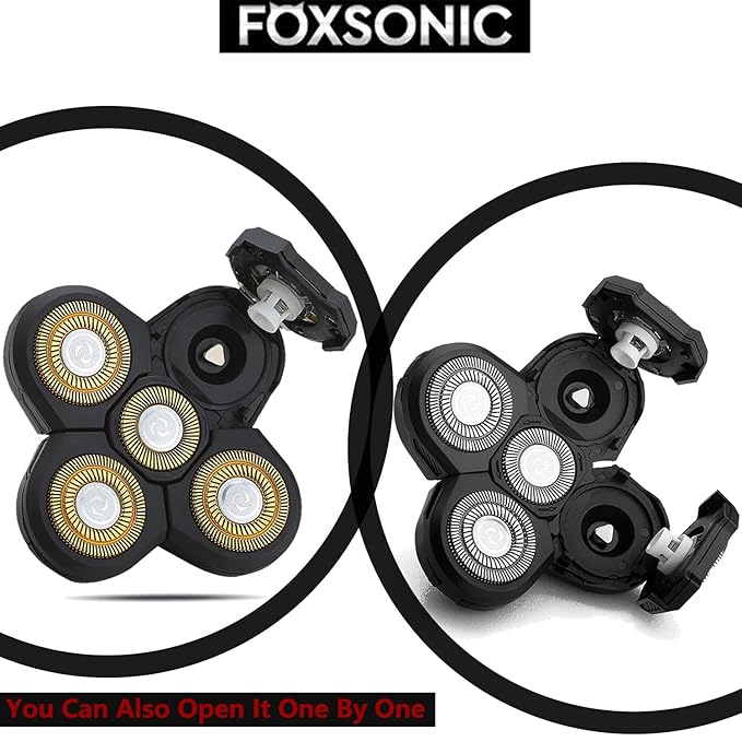 - ★ Foxsonic 5 heads 5 blades men's electric shaver features special electroplate surfaces for anti-abrasion, double-ring hypoallergenic stainless blades. Its 5D flex floating heads rotate to follow the contours of your face, head, neck and jaw, offering closer and cleaner trimming without skin irritation.