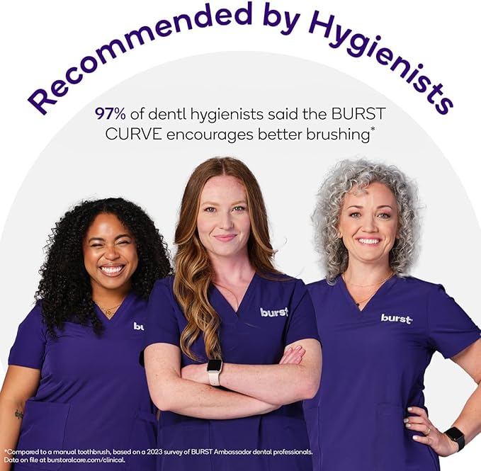 - π¦π¨π£ππ₯ π¦π’ππ§ ππ₯ππ¦π§πππ¦: Includes our customer favorite super soft, hygienist-approved, tapered bristles. They clean without damaging gums, reach below the gumline and make teeth feel deliciously smooth, making the BURST Curve a great soft toothbrush for adults.