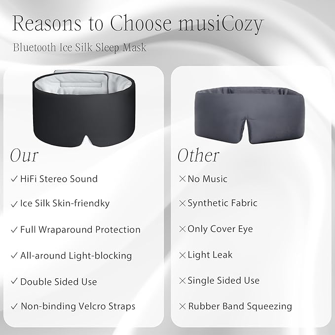 - Soft and Comfort: Crafted from the finest ice silk and natural cotton, our Sleep Mask with Bluetooth headphones offers a dual-texture experience. the exterior ice silk side provides a smooth, luxurious feel, while the interior breathable side delivers a soft, lightweight comfort. Designed to be gentle on sensitive skin, it alleviates pressure on the eyes and offers a cool, silky, and comfortable touch for your skin, eyes, and hair