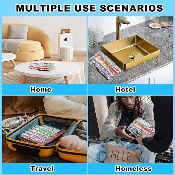- MULTIPLE USE SCENARIOS:Office toothbrush kits are individually packed so they don't take up too much space. Applicable to hotels, guest travel, aviation, home, bathroom and other places, also applicable to the homeless, hotels, women's shelters, homeless care kits, etc