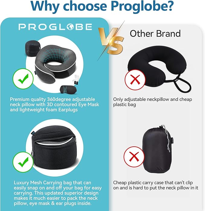- Proglobe Essential Neck Pillow Series - makes resting, riding, and sleeping much healthier with proper support. designed to improve comfort while resting, traveling, or sleeping. Helps reduce neck strain and supports better posture during long trips. Crafted with medium to firm memory foam. Ideal for use in cars, planes, or at home while reading, watching media, or relaxing.
