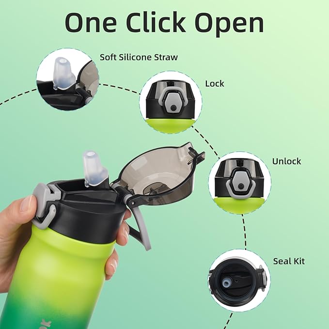 - Leak Proof Locking Lid: Open Your Insulated Water Bottle With The Simple Push Of A Button, Easy For One-Handed Use, The Bottle Has A Protective Cap That Keeps The Drinking Spout Clean, Has A Silicone Locking Latch To Prevent The Lid From Opening