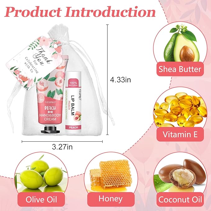 - 【Unique Party Favors for Guests】Our hand cream bulk and lip balm bulk set have 5 different fragrances - Lemons,grapes,peaches,aloe and honey.In addition,5 different colors are perfect for weddings and party,these thank you gifts can be distributed as gratitude gifts to guests and coworkers.