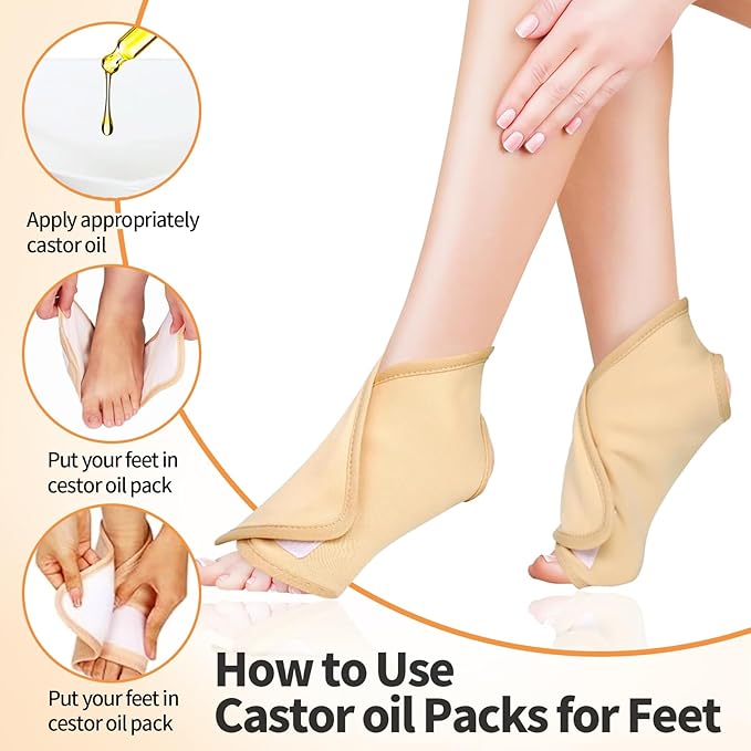 - Castor oil Packs for Feet: Our castor oil packs fits for both men and women foot, alleviate ankle pain caused by inflammation, sprains, arthritis, achilles tendinitis, plantar fasciitis, gout, heel spurs, sprained ankles. And it makes your feet skin soft and moisturized.