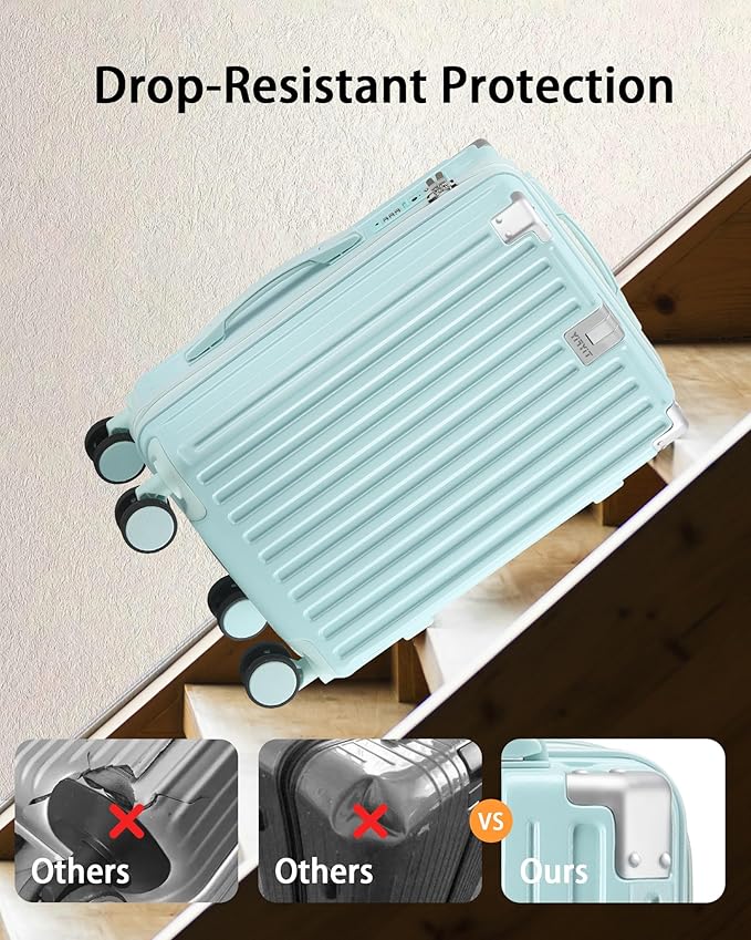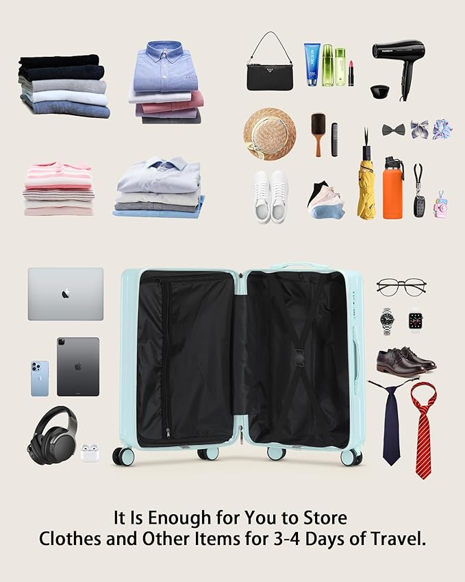 - 【Lightweight Durable Material AND Airline Approved Luggage】The luggage is crafted from PC (Polycarbonate) material, Enhance the suitcase to be even lighter yet sturdy, ensuring prolonged durability for extended use.Dimensions: 36.5x24x57cm (including wheel and handle height), weighing only 3.1kg. The 20in carry-on luggage is designed to meet the carry-on limitations of most major airlines worldwide. It fits conveniently in the overhead compartment, eliminating additional handling fees.