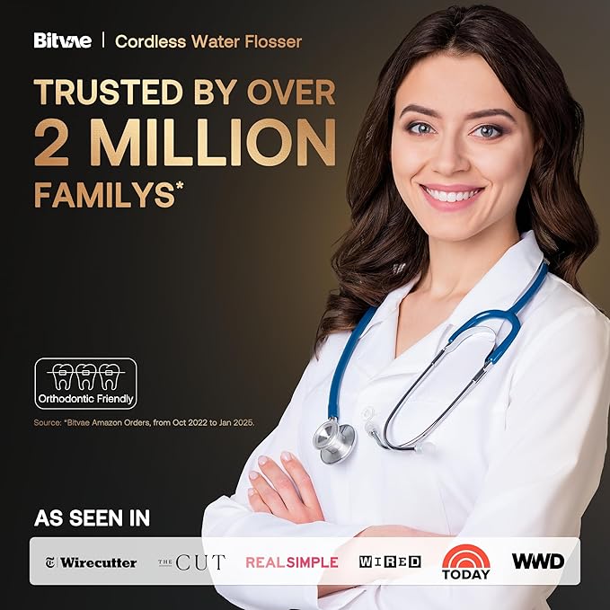 - 6 Replacement Tips and 360° Reach Every Corner: With multiple nozzle types catering to diverse family needs. Its 360° rotary tips can easily clean areas, while the orthodontic and tongue cleaning tips provide specialized care