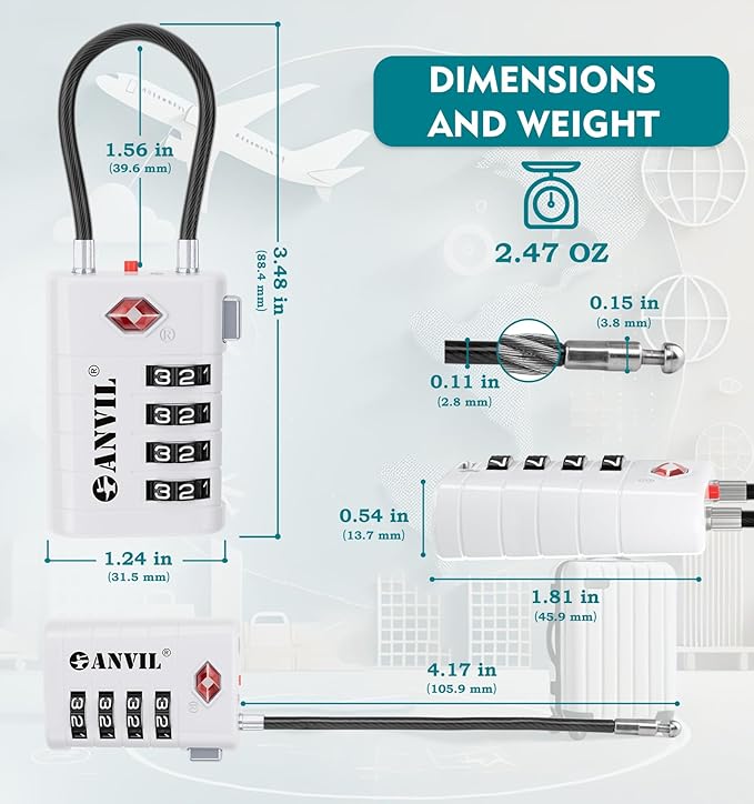 - ★ Enhanced Security with TSA008 Core and Four-Digit Combination: The ANVIL Luggage Lock, one of the top TSA-approved locks for luggage, features the industry-leading TSA008 core. This advanced internal mechanism significantly prevents unauthorized access, making it a reliable choice among luggage locks.