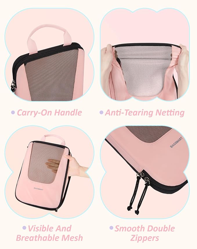- 4 Set Packing Cubes - Are you fed up with the travel kind of messy suitcase? Travel with BAGSMART PACKING CUBES and they make a world of difference. The 6-piece packing cubes contains 3 travel cubes + 1 shoe bag, keeps your outfits in separate packing bags, and makes your luggage clean and neat while traveling
