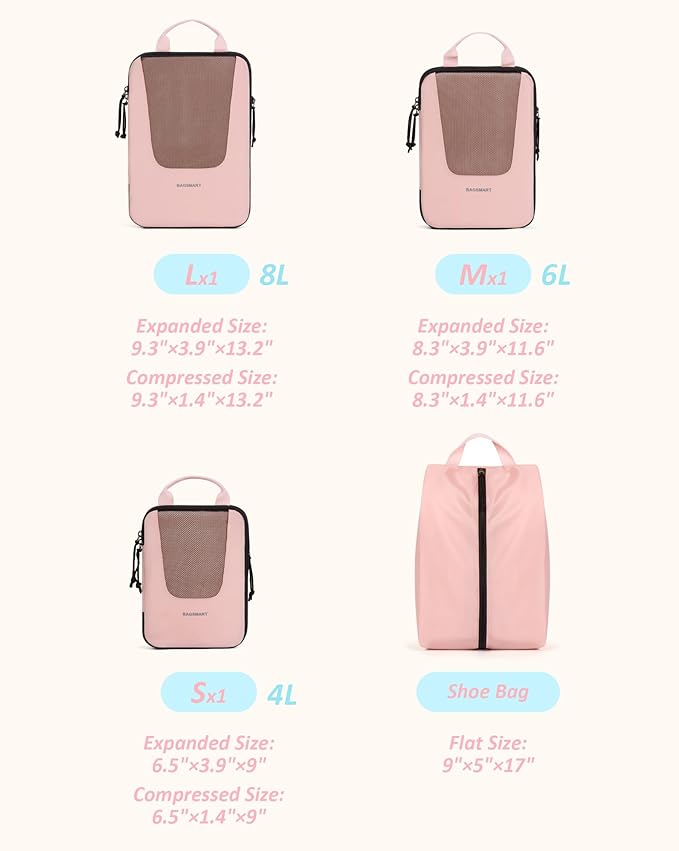 • 4 Set Packing Cubes - Are you fed up with the travel kind of messy suitcase? Travel with BAGSMART PACKING CUBES and they make a world of difference. The 6-piece packing cubes contains 3 travel cubes + 1 shoe bag, keeps your outfits in separate packing bags, and makes your luggage clean and neat while traveling