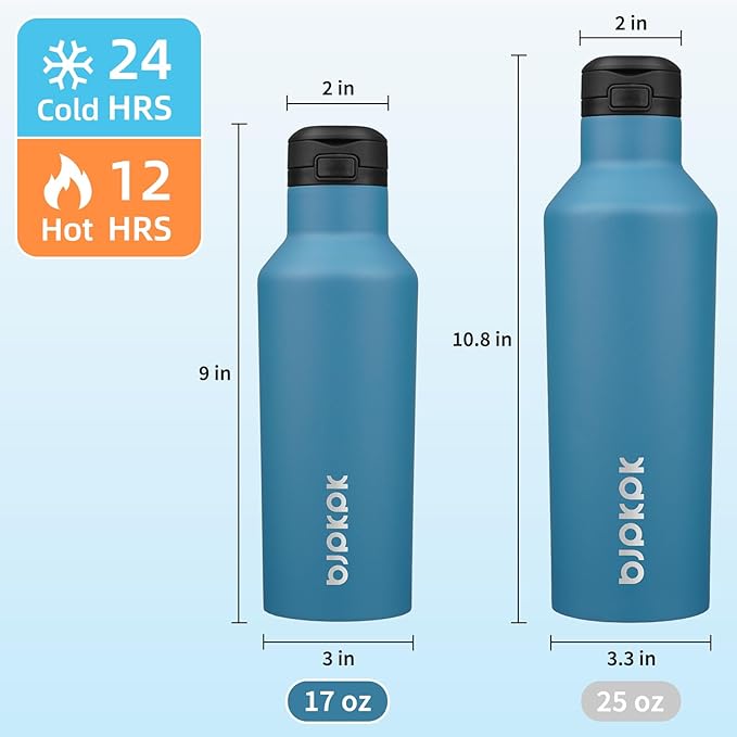 - Metal Water Bottle: Made of premium 18/8 food grade stainless steel, durable and resistant to corrosion, adopt double walled vacuum insulation technology keeps your favorite beverages ice cold for 24 hours and hot for 12 hours