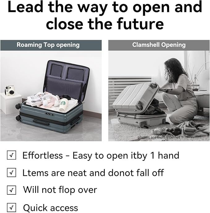- 【CREATIVE FRONT OPENING】 Leading the future opening and closing method which is effortless to open or close the suitcase, not only is it easy to load, but it also saves space.This design solves the problem that traditional luggage separated 2 compartments of heavy load then it's difficult to open and close.Importantly, it also avoid the displacement of items.