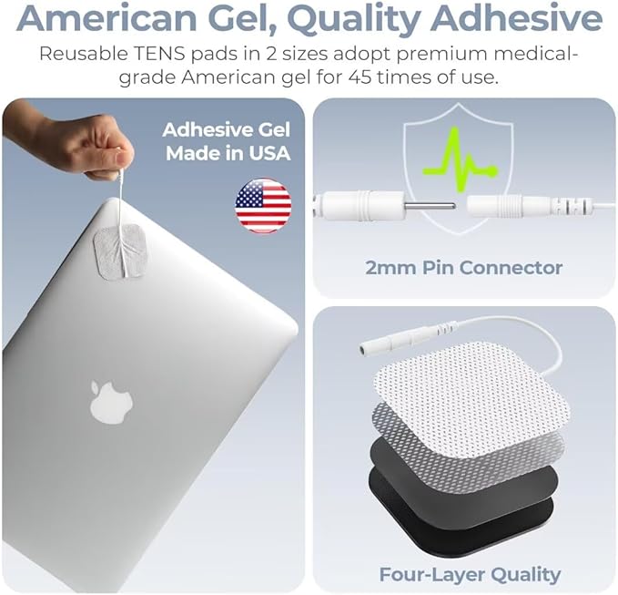 - 4 Outputs with 8 TENS Pads: If you want efficient pain relief therapy for 4 body parts at the same time or enjoy relief with your lover, this TENS machine is the ideal choice. It features 4 outputs for multi-area treatment with up to 8 American Gel TENS pads. The electrode pads in 2 sizes can meet your specific relief needs. The 2" x 2" electrodes are ideal for shoulders or necks, and the larger 2" x 4" pads are suitable for large body areas like the back