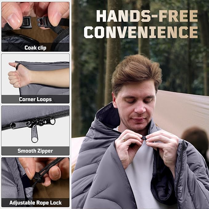 - Versatile Design: Transform this multifunctional blanket into a quilt, poncho, temporary sleeping bag, or mat. An adjustable drawstring creates a footbox for personalized warmth and breathability, while four corner loops secure it to the ground—perfect for picnics. Adapt it to your needs, whether camping, hiking, or relaxing at home