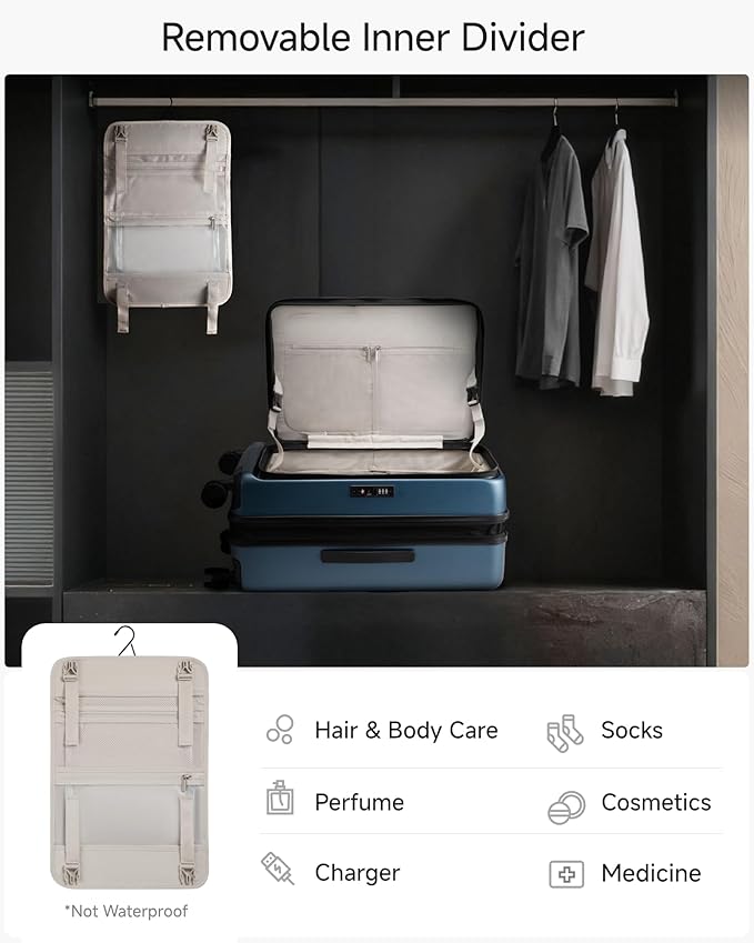 - 【FLO5 Vertical Access System】Tired of wrestling with luggage on the floor? FLO5’s innovative vertical-open design lets you access your belongings upright in narrow aisles or against a wall, saving valuable space and keeping your clothes off the ground—perfectly built into this 24 inch luggage.