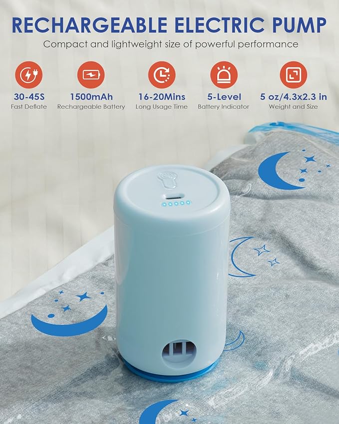 - 【Rechargeable Electric Air Pump for Easy and Fast Deflating】Our Vacuum Compression Bags comes with an Rechargeable Electric Air Pump, And it is built in 1500mAh rechargeable battery, which is able to work about 16-20mins continuously after fully charged, you just need to double click the power button and attach to the valve port, then just wait for a few seconds and will done. Unlike the hand pump, it is much easier and faster to suck the air out of the vacuum bags, you don't need to use your strength to pull and push the pump again and again to take the air out of the bags