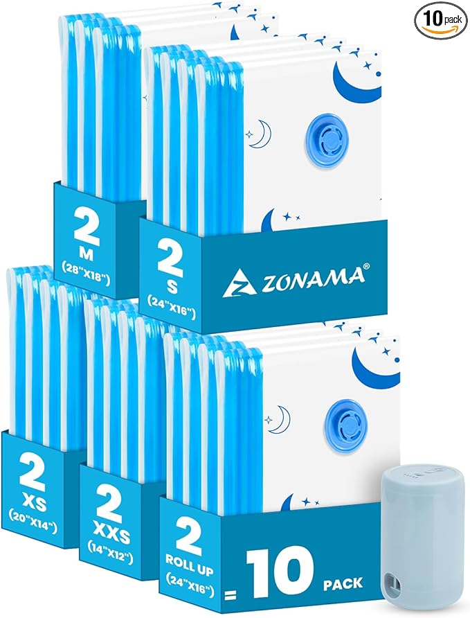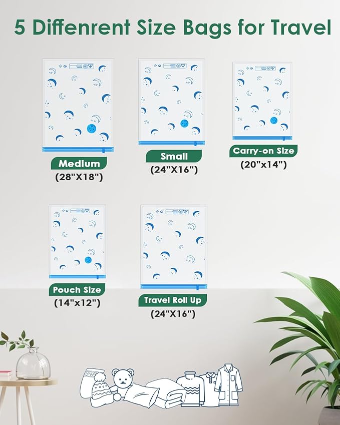 - 【10 Pack in 5 Different Size】We provide 10 pack Travel Vacuum Storage Bags in 5 different sizes, 2 Medium, 2 Small, 2 Extra Small Carry on Size, 2 Extra Small Pouch Size and 2 Roll Up Bags (without cap), The size is great for pack your checked luggage and ensure you have enough room for both your essentials and potential shopping you may do during your vacation. One side of each bag is clear, it's very helpful to find out what you put inside the bags, the other side is opaque, great to protect your privacy when you open your suitcase for security check