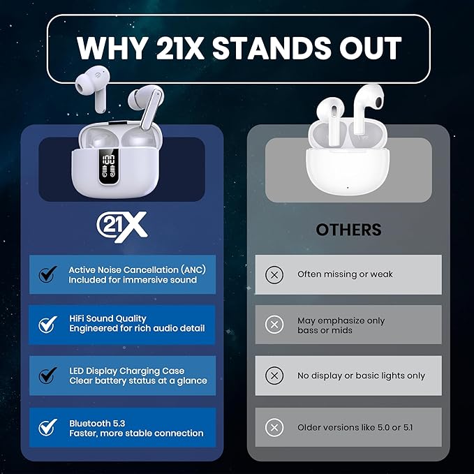 - BLUETOOTH 5.3 FOR SMOOTH CONNECTIVITY: Equipped with advanced Bluetooth 5.3, these true wireless earbuds offer fast, energy-efficient connections up to 33 feet. Enjoy reduced latency, stable pairing, and uninterrupted audio when streaming, calling, or gaming. Compatible with smartphones, laptops, smart TVs, and more—including both iOS and Android devices—the 21X earbuds keep you wirelessly connected across all your favorite platforms.