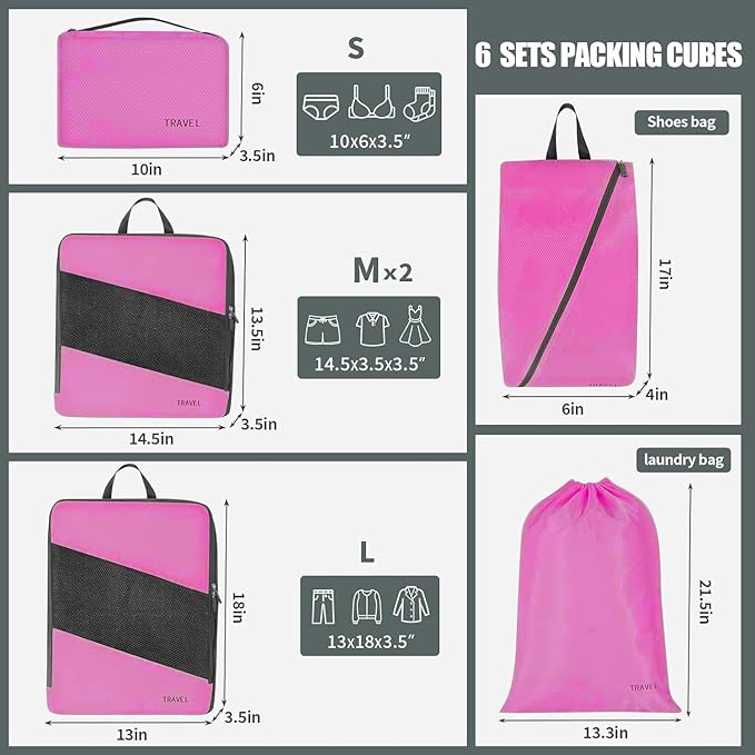 - 6 Sets of Packing Cubes: 1 large cube, 2 middle size cubes, 1 toiletry bag, 1 shoes bag, 1 laundry pouch. Fit clothes &carry-ons for two-week trip.