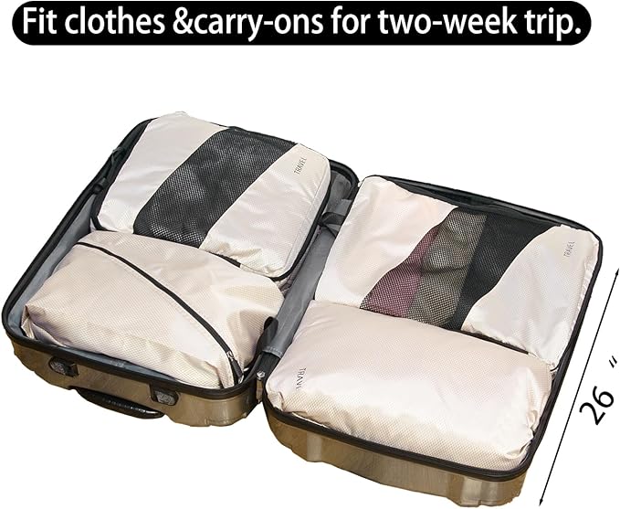- Suitcase Space Saving Organizer: use the compression zipper, it can save up to 30%-50% of your luggage space. includes 1 large cube, 2 middle size cubes, 1 toiletry bag, 1 shoes bag, 1 laundry pouch. fit clothes &carry-ons for two-week trip.