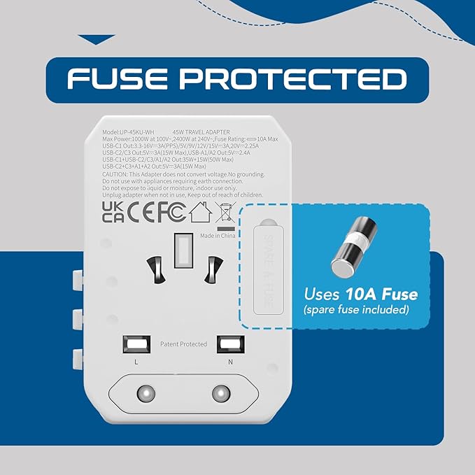 - [SAFETY AND RELIABILITY] – Ceptics universal adapter for travel is CE and RoHS certified, ensuring it meets rigorous safety standards. This travel power adapter features a 10A fuse with an included spare, providing protection against power surges and short circuits, keeping your devices safe during your travels.