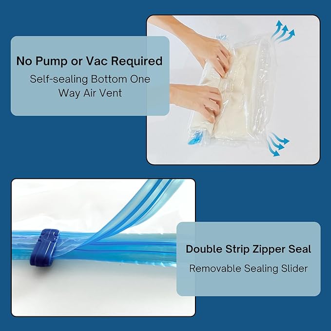 - Easy to Use: Just place your items inside, seal with the included reinforced zipper sliders, roll or fold to get air out, the self-sealing one way bottom air vent will prevent the bag to reinflate