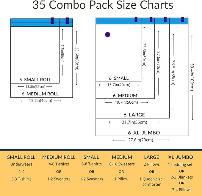 - 35 Combo Pack includes: 6 Jumbo, 6 Large, 6 Medium, 6 Small, 6 Medium Roll Up (Compression), 5 Small Roll Up (Compression), Hand Pump