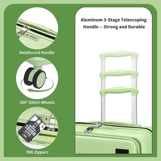 20 inch Carry On Luggage Front Open Pocket Extension Bag, ABS+PC Suitcase with Spinner Wheels TSA Lock & YKK Zipper, 20in/Toiletry Bag/Handbag, Light Avocado Green