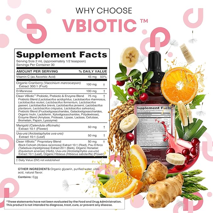Clean Nutraceuticals VBiotic Vaginal Probiotic for Women Liquid Drops | Cranberry Uva Ursi Horsetail D-Mannose Prebiotics Marigold & Black Cohosh Vaginal Health Supplement | pH Balance