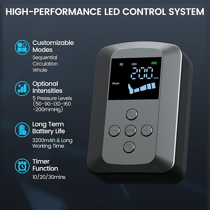 - Customizable Performance Modes: 5 adjustable pressure levels (50-200mmHg) and 3 air compression modes( Sequential, Circulation and Full-Leg), plus 10/20/30-minute timer for personalized sessions