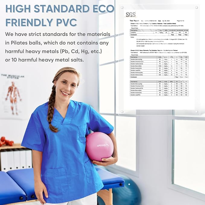 - [SAFE MATERIAL] The 9 inch workout ball is crafted from high-quality, eco-friendly PVC material, these exercise balls physical therapy meet strict standards to ensure safety and durability. They are soft, flexible, and skin-friendly, containing no harmful heavy metals such as Pb, Cd, Hg, etc., or 10 harmful heavy metal salts