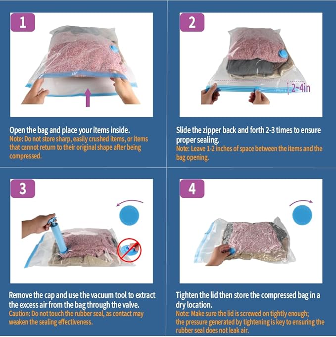 - Easy to Use: Fill the bag, seal the zipper, suck out excess air, close the valve! Effortless even for first-time users. Includes a hand pump, compatible with electric pump and common household vacuum cleaners