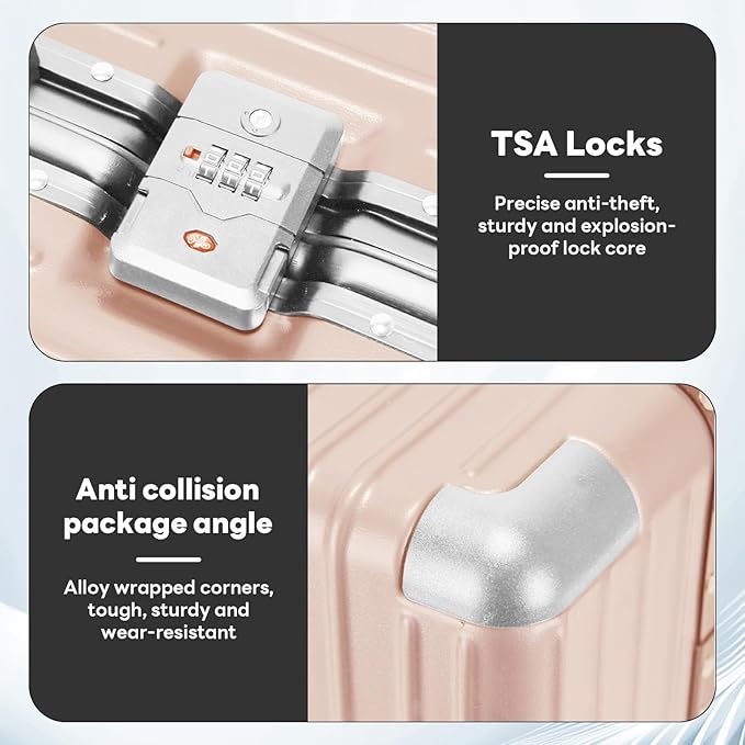 - 【High-Quality Materials】Lightweight Carry on Luggage with Superb Durable Material: The suitcase Used ABS+PC+Aluminium Frame Lightweight Hardside material to prevent dents and scratches. And unique corner protectors help protect high impact areas during travel