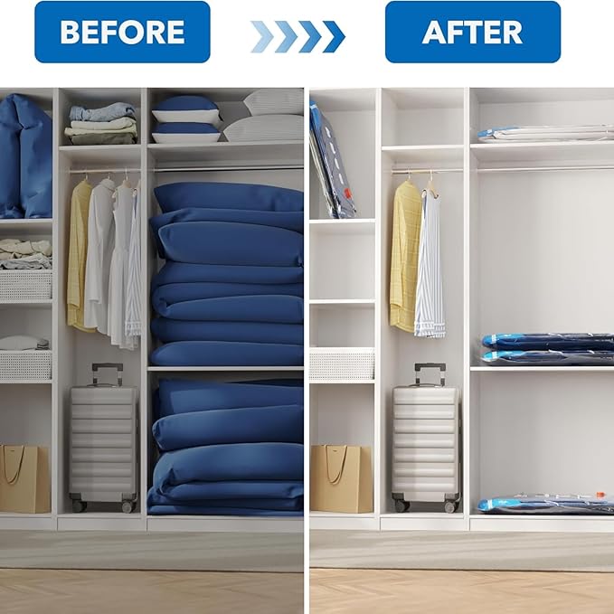 - 80% Space Saver Bags: These simple bags can be easily loaded and sealed using a home vacuum cleaner to reduce larger and fluffier articles of clothing like vests and winter coats to their minimum possible size. Vacuum compression bags are also handy for comforters, blankets, duvets, towels, clothes, pillows, linens, plush toys, and more. Our space saver bags are an ideal solution for adding more storage space to your wardrobes, closets, garages, basements, lofts, and suitcases.