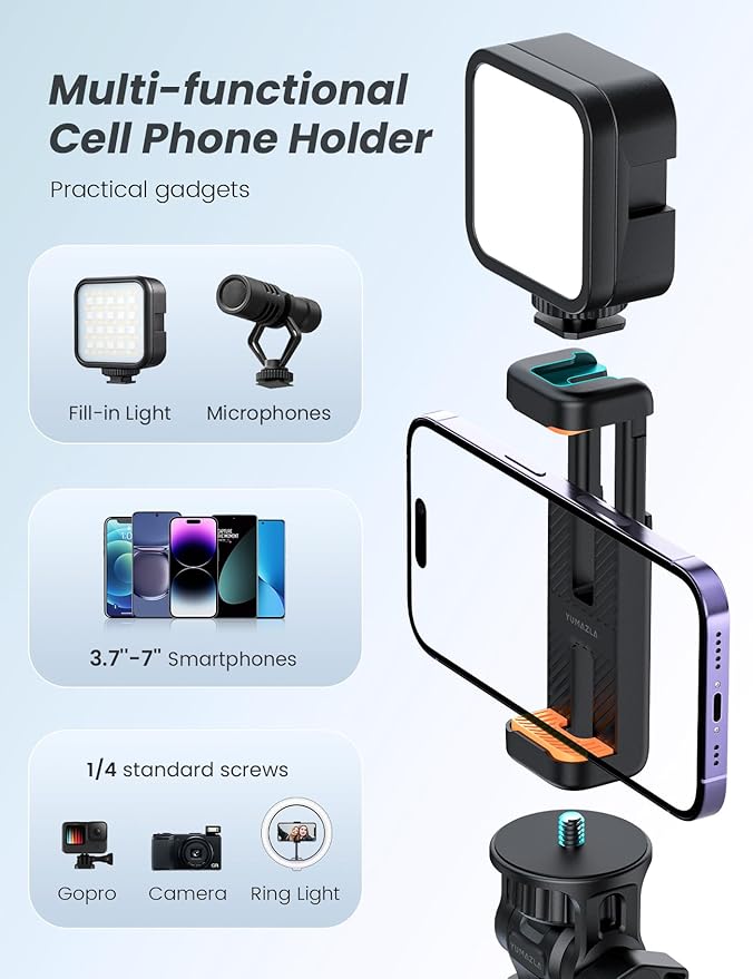 - User-Friendly and Versatile: Equipped with additional accessories such as a standard smartphone holder and remote control, this tripod offers excellent practicality and versatility. The remote control is compatible with most smartphones, and the cold shoe port is equipped above the mobile phone holder, so one holder for multiple purposes is as good as it gets!