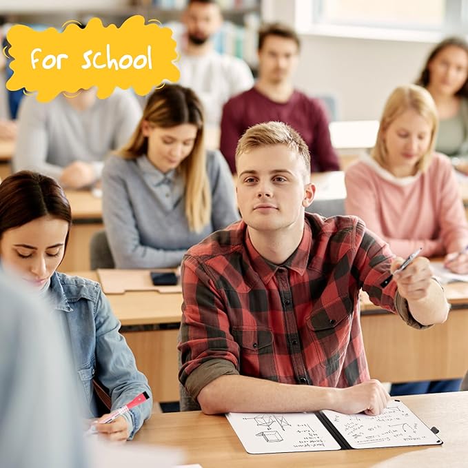 - 【Complete Accessories for Instant Use】The whiteboard notebook set comes with a pen bag, three colored pens, and a large eraser. Each pen has a built-in eraser for quick corrections, and the board includes a pen holder so you’re always ready to write.