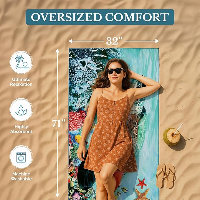 - Oversized & Double-Sided Prints – Inspired by Iconic Beaches: Each towel measures a generous 71"x32" (180x80 cm), providing plenty of space for comfort. Designed with double-sided prints, our towels feature stunning patterns inspired by world-famous beaches and bays. Whether at the pool, beach, or camping, enjoy vibrant colors that won’t fade, even after machine washes.