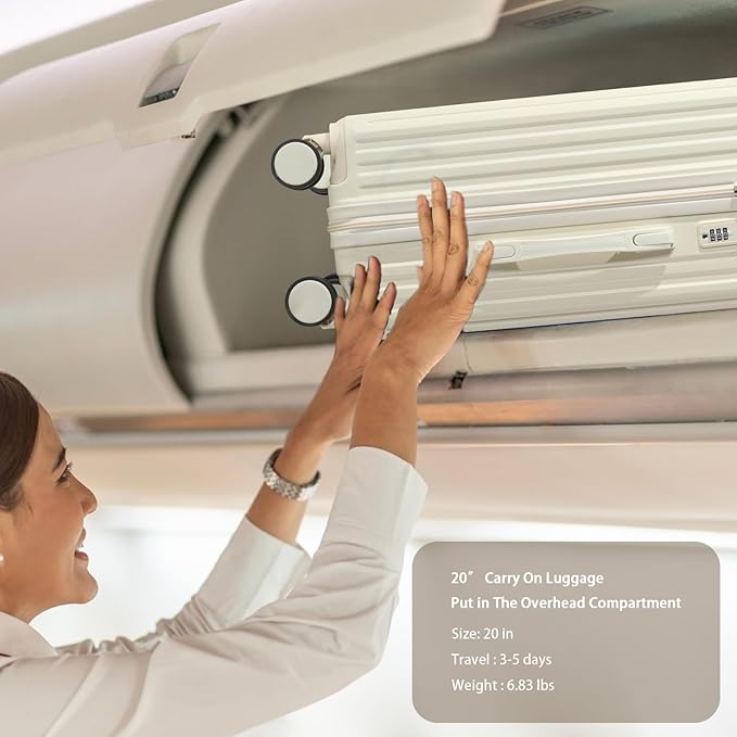 - 【Lightweight Durable Material AND Airline Approved Luggage】The luggage is crafted from PC (Polycarbonate) material, Enhance the suitcase to be even lighter yet sturdy, ensuring prolonged durability for extended use.Dimensions: 36.5x24x57cm (including wheel and handle height), weighing only 3.1kg. The 20in carry-on luggage is designed to meet the carry-on limitations of most major airlines worldwide. It fits conveniently in the overhead compartment, eliminating additional handling fees.