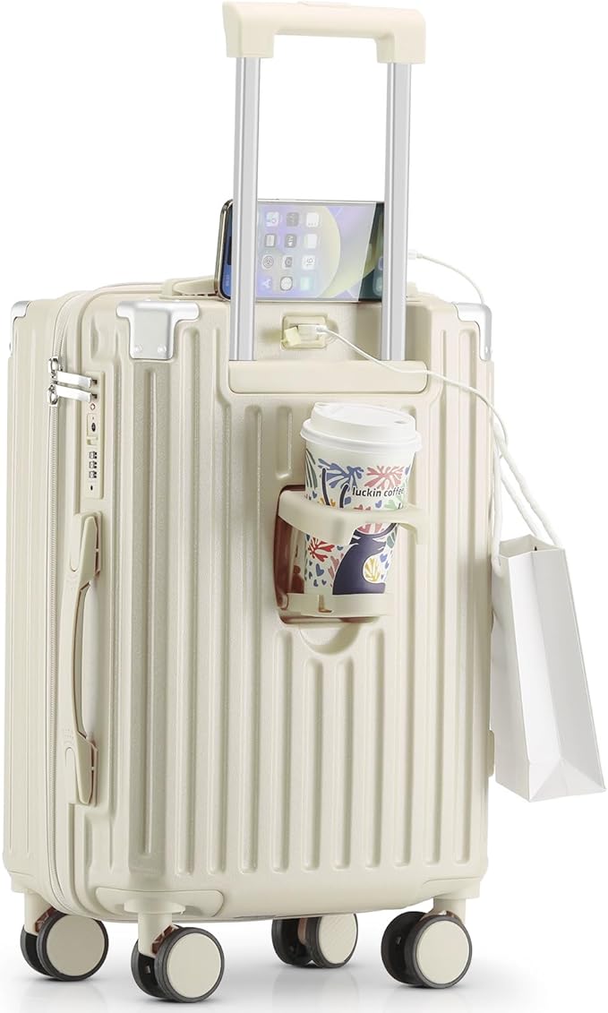 20 Inch Carry On Luggage With Cup Holder & USB Port, Airline Approved TSA-locked Luggage, Lightweight PC Material Travel Suitcase With 360° Spinner Wheel (20in-White, 20in)