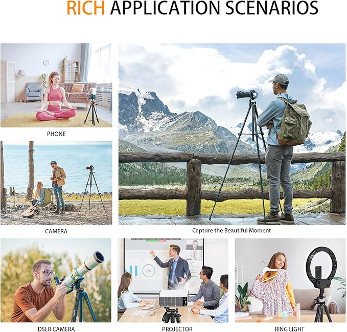 - Wide Compatibility: This versatile tripod supports most devices with a 1/4-inch threaded hole, including cameras canon g7x, g7z, m50, t6, t7 etc, projectors, laser levels, ring lights, telescopes, and more. It features a universal phone holder compatible with most smartphones, offering 360° rotation and two universal cold shoe mounts.
