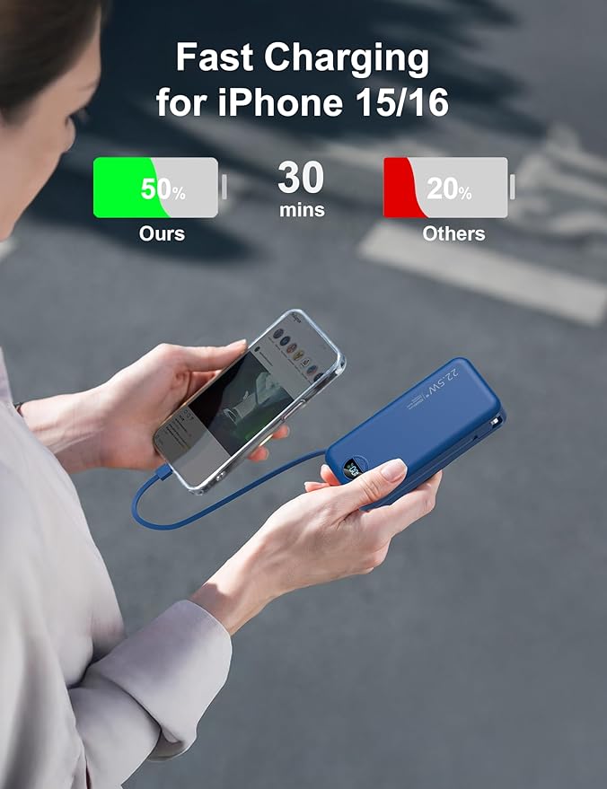 20000mAh Ultra-Portable-Charger-Power-Bank with Built in Cables&AC Wall Plug,PD20W USB-C Fast Charging Cell Phone Charger Battery Pack,LED Display Travel Battery Bank for All iPhone,Samsung,Android