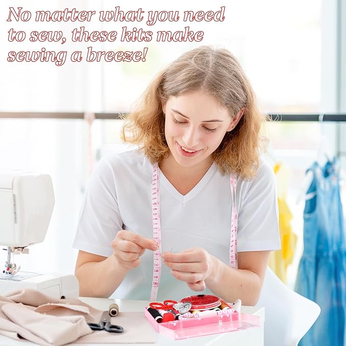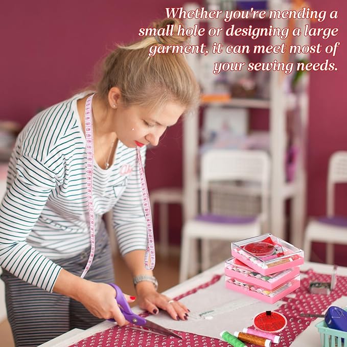 - Comprehensive Sewing Kit: this sewing kit for home meets a variety of sewing needs, making it essential for beginners and seasoned crafters; With plastic boxes for organization, per box including 8 different colors of threads, 16 hand needles, 1 scissors, 1 needle threader, 1 tape measure ruler and 1 thimble, everything is at your fingertips for daily repairs or creative projects; This selection equips you for tasks, from patching holes in clothes to intricate embroidery