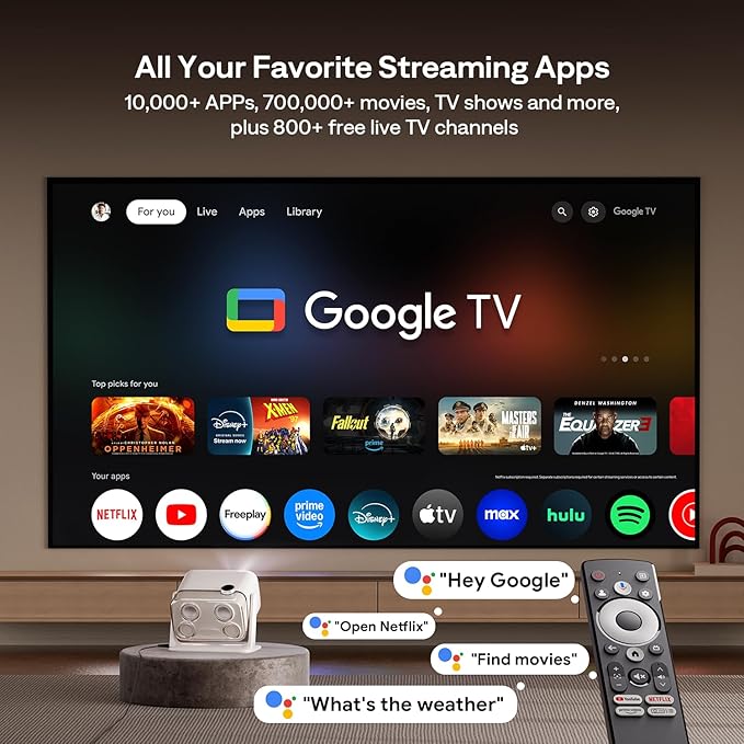 - Smart Projector - Built-in Official Google TV, All Your Favorite Streaming Apps Included: BOOM mini smart projector brings built-in Google TV to your big screen, unlocking 10,000+ apps, including NetfIix, YouTube, officially licensed Disney+, Hulu, Peacock and Paramount+. No extra streaming stick needed. Enjoy smooth, uninterrupted entertainment—just plug in, power up, and start watching.