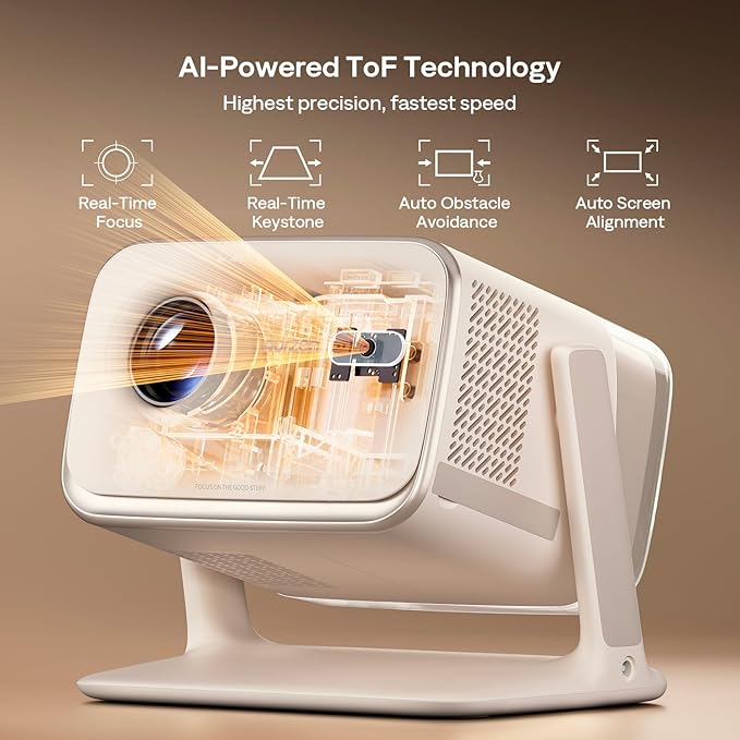 - Portable Projector - Always in Focus, Ready in 3 Seconds: Powered by advanced ToF technology, BOOM mini 4K projector delivers real-time auto focus and keystone correction in just 3 seconds—far faster than others in its class. Even if moved or bumped, it instantly readjusts, keeping visuals sharp and your experience uninterrupted. Ensure an immersive viewing experience.