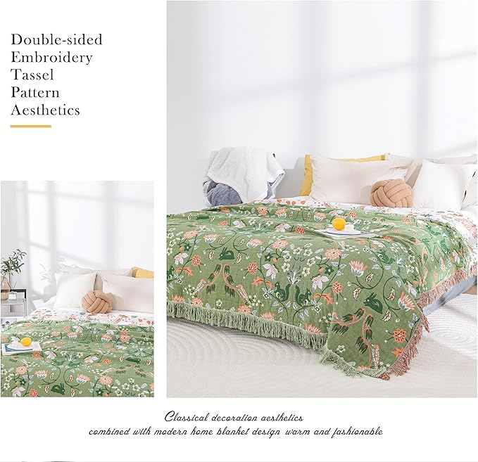 Boho Throw Blanket for Bed 100% Cotton Ultra Soft Rustic Quilt Farmhouse Decor Bed Fall Blankets,All Season Rustic Throw for Sofa Couch Chair (Green World, 60"×80")