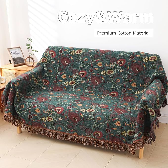 Boho Throw Blanket for Bed 100% Cotton Ultra Soft Rustic Quilt Farmhouse Decor Bed Fall Blanket,All Season Rustic Throw for Sofa Couch Chair (Flower-Dark Green, 90"×98")