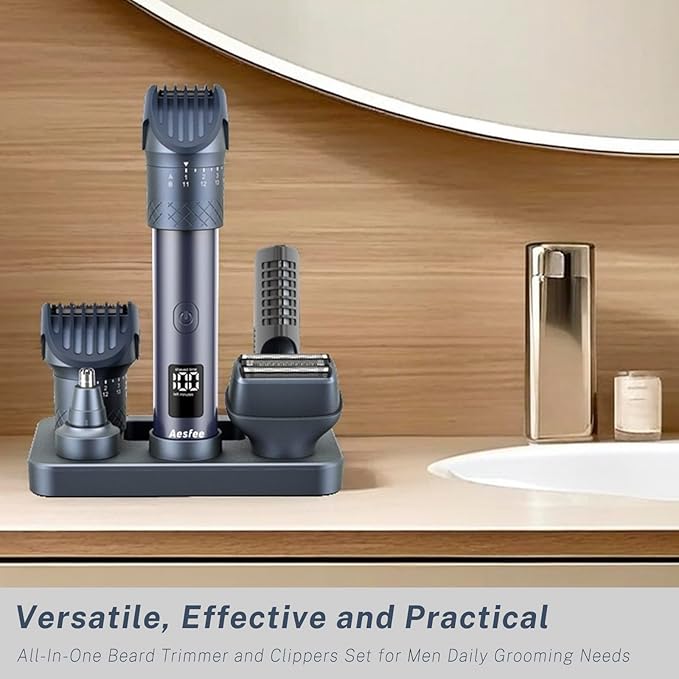 - [ Versatile & Effective ] - The Aesfee all in one beard trimmer for men offers a versatile grooming solution, combining multiple functionalities into a single device. With attachments for beard trimming, hair clipping, body grooming, and nose/ear hair removal, it caters to a comprehensive range of grooming needs. This electric beard trimmer for men is an excellent choice for those seeking precision and versatility in their grooming routine