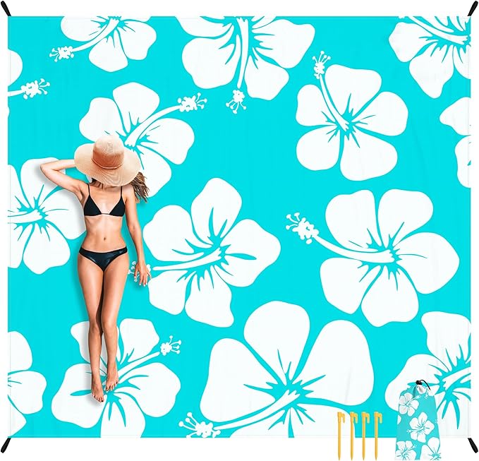 - Tropical-Inspired & Eye-Catching: Featuring a bold Hawaiian hibiscus floral pattern, this beach blanket brings a vibrant, summery feel to any beach trip. The crisp white flowers contrast beautifully against a turquoise blue background, evoking the essence of paradise.